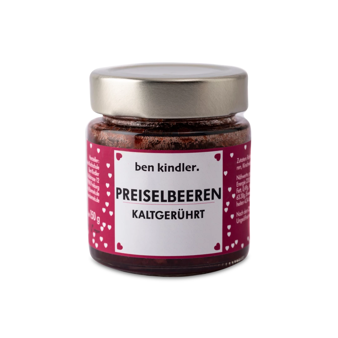 Für seine Version dieses vor allem in Skandinavien beliebten Kompotts verwendet Ben Kindler nur handverlesene Preiselbeeren und besten Rohrzucker. Abgerundet wird das Ganze mit etwas echtem Schwarzwälder Kirschwasser.