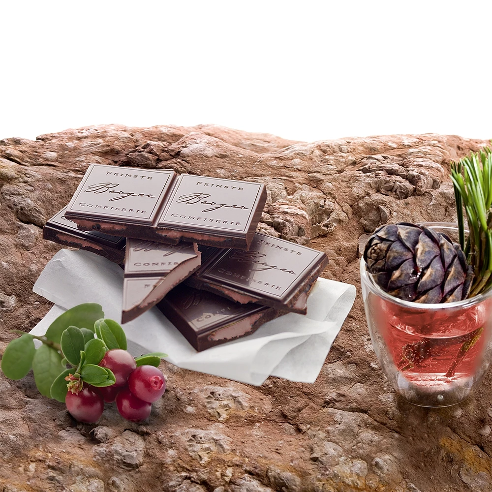 Herb süße Preiselbeeren kombiniert mit aromatischen Zirbenschnaps bringen als feine Ganache umhüllt von Edelbitterschokolade ein kleines Stück Waldgenuss auf den Gaumen.