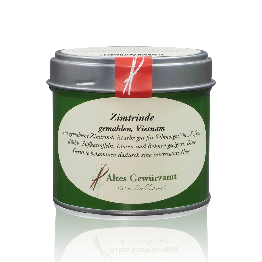 Verwendung: passt nicht nur zu Süßem, sondern verfeinert raffiniert Herzhaftes, wie Schmorgerichte, Lamm, Kürbis, Süßkartoffeln, Linsen und Bohnen; für Saucen, besonders Tomatensauce! | Zutaten: gemahlener Cassia-Zimt | Allergenkennzeichnung: kann produktionsbedingt Spuren von Sellerie enthalten | Aufbewahrungshinweis: dunkel, trocken, kühl und luftdicht verschlossen lagern – nicht über oder direkt dem Herd aufbewahren, da Wärme und Feuchtigkeit das Aroma vermindern können | Inverkehrbringer: Altes Gewürzamt GmbH Ingo Holland, Frühlingstraße 37, 63911 Klingenberg am Main