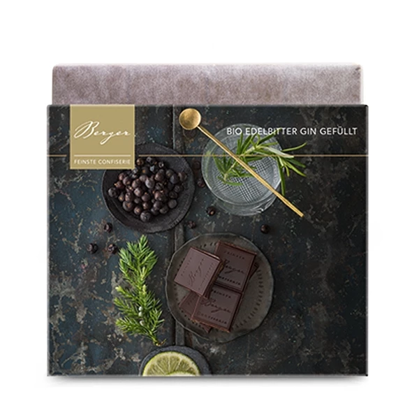 Die botanischen Aromen von edlem Gin harmonieren besonders mit der herben BERGER Edelbitterschokolade mit min. 70 % Kakao. Eingebunden in eine cremige Füllung, schenkt der bekannte Gin aus der Edelbrennerei Grünegg hochprozentigen Genuss in seiner süßesten Form.