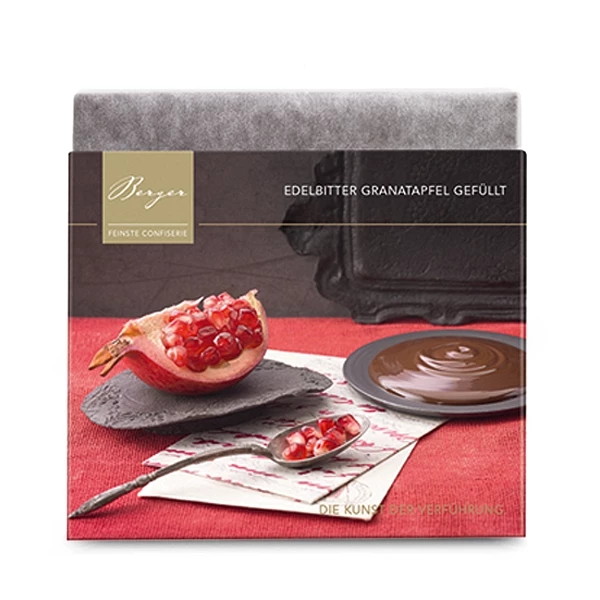 Mit dieser Edelbitter-Granatapfel-Creme-Schokolade kaufen Sie ein von Berger Feinste Confiserie viel Liebe hergestelltes Produkt. Seit 1994 produzieren Christine und Hubert Berger hauchzart gefüllten Schokoladentafeln und als Abwandlung der klassischen Praline gedacht sind. Besonderes Merkmal sind die unterschiedlichen Geschmacksrichtungen, die kreativ und immer wieder neu komponiert werden. Feinste Füllungen werden sehr sorgfältig gekocht, in hauchdünne Schokoschälchen gegossen, mit zartschmelzender Schokolade überzogen und am Ende kunstvoll händisch garniert.