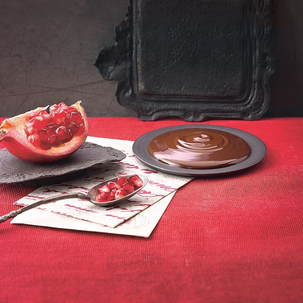 Feine Edelbitterschokolade mit 70 % Kakaoanteil umhüllt eine edle Granatapfel-Creme