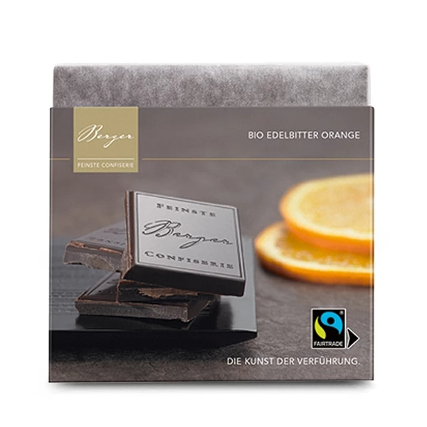 Mit dieser Edelbitter Orange Schokolade kaufen Sie ein von Berger Feinste Confiserie viel Liebe hergestelltes Produkt. Seit 1994 produzieren Christine und Hubert Berger hauchzart gefüllten Schokoladentafeln und als Abwandlung der klassischen Praline gedacht sind. Besonderes Merkmal sind die unterschiedlichen Geschmacksrichtungen, die kreativ und immer wieder neu komponiert werden. Feinste Füllungen werden sehr sorgfältig gekocht, in hauchdünne Schokoschälchen gegossen, mit zartschmelzender Schokolade überzogen und am Ende kunstvoll händisch garniert.