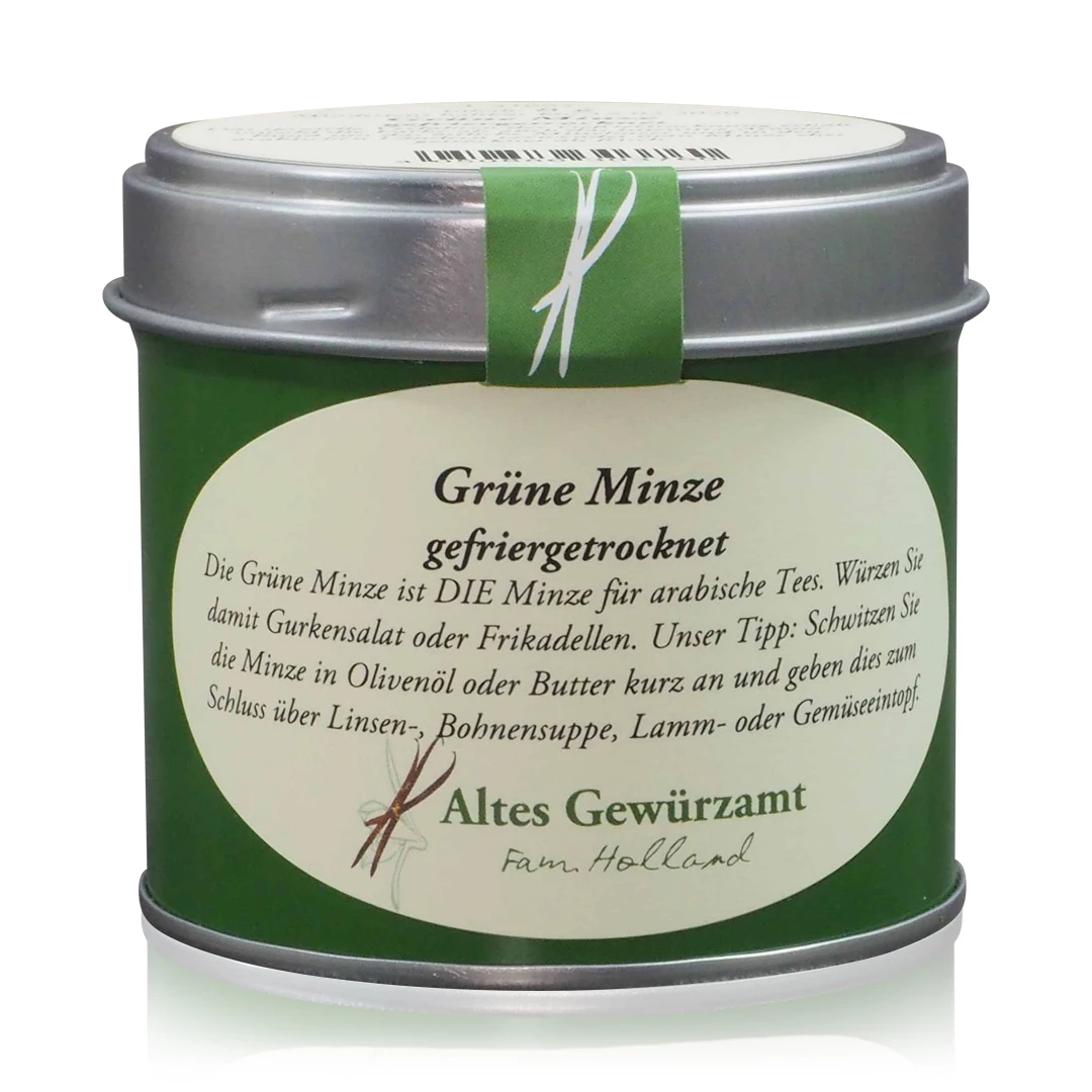 Mit dieser getrockneten Grünen Minze kaufen Sie ein von Altes Gewürzamt Ingo Holland sorgfältig ausgewähltes und zusammengestelltes Gewürz in bester Qualität. Gründer Ingo Holland – selbst langjähriger Spitzen- und Sternekoch – hatte irgendwann genug davon nur Gewürze kaufen zu können, die nicht seinem Qualitätsanspruch gerecht wurden. So entschloss er sich, selbst auf die Such nach besten Qualitäten von Gewürzen aus aller Welt zu gehen und diese in seiner eigenen Manufaktur handwerklich, schonend und sorgfältig zu verarbeiten. Berühmt auch seine Gewürzmischungen für Chili con Carne oder das italienisch toskanische Gewürzmischung für Pasta.