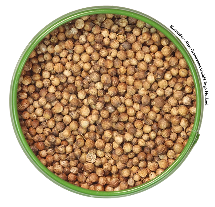 Koriander ist eines der vielseitigsten Küchenkräuter, speziell in der Küche Südostasiens. Koriandersamen sind eine beliebte Zutat beim Backen (Brot) oder deftigen Eintöpfen. Unabdingbar gehören sie in asiatischen Gewürzmischungen wie Currypulver oder Pasten. Aber auch Lebkuchen oder Likören verleihen sie ihr typisches Aroma. Koriandersamen sind eigentlich die Früchte des Korianders. Er ist eines den ältesten kultivierten Gewürzen und lässt sich bis in die ägyptische Hochkultur vor 5.000 Jahren zurückverfolgen. Neben den Früchten wird auch das frische Kraut ähnlich wie Petersilie verwenden.