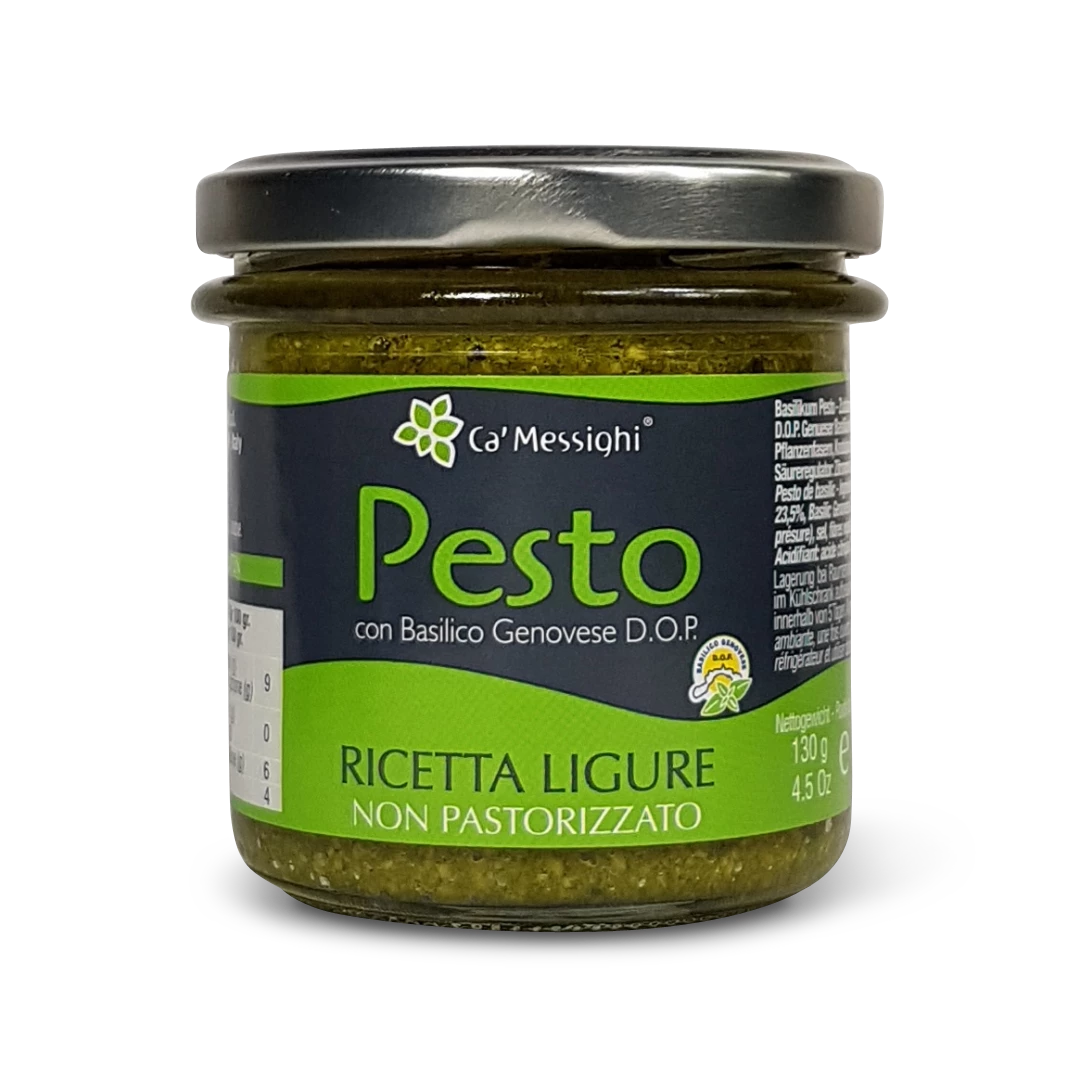 Großvater Luigi sagte eins: Nur wenn man mit guten Sachen arbeitet, wird es gut. Mit dieser Basilikum Pesto nach Ligurischem Rezept kaufen Sie eine von Ca’ Messighi handwerklich nach ligurischer und italienischer Tradition hergestellte Pastasauce. Aus DOP-zertifiziertem Genueser Basilikum und großartigem Olivenöl produziert Ca’ Messighi u.a. traditionelles Pesto Genovese, Pesto Rosso und die berühmte ligurische Walnusssauce Crema di Noci.