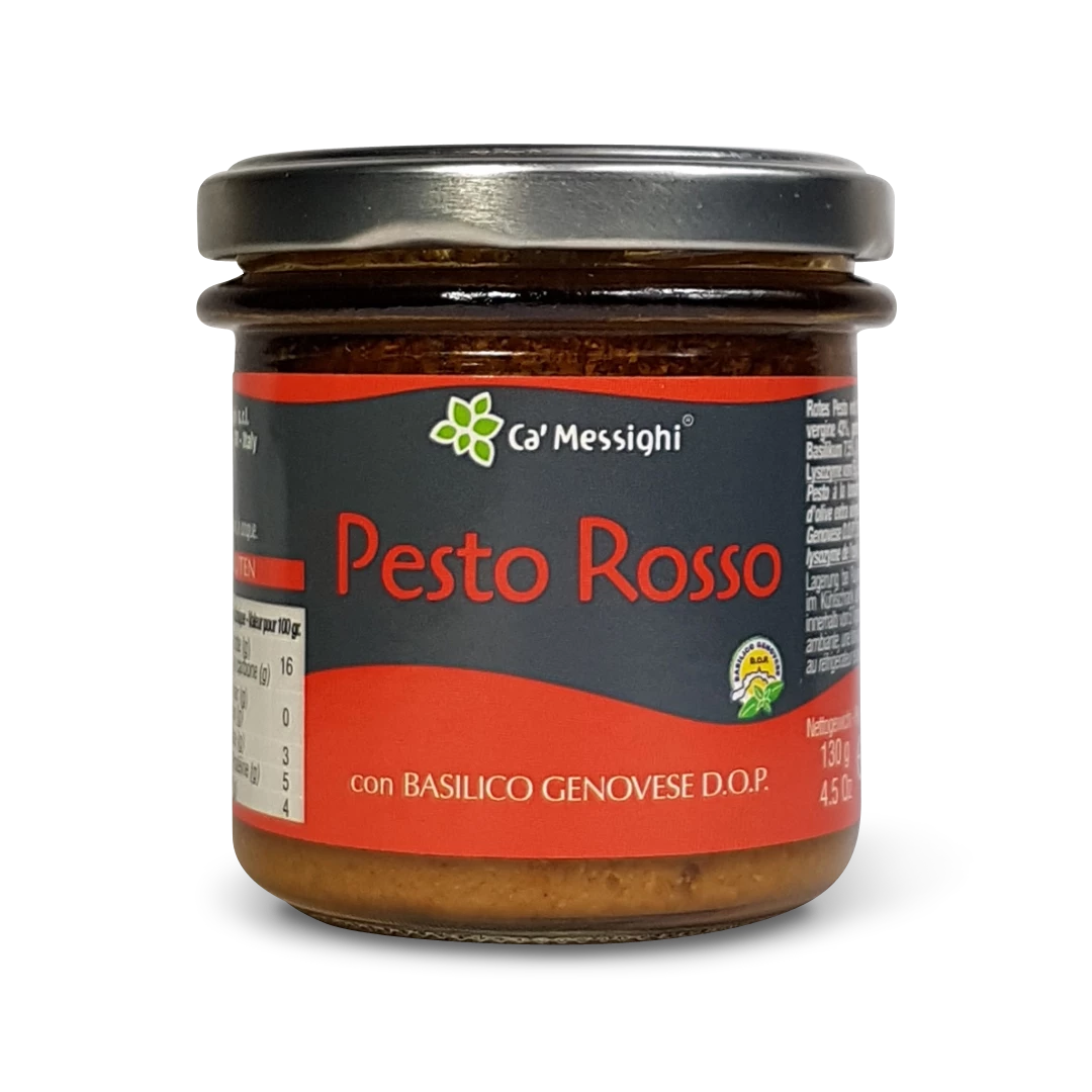 Probieren Sie dieses delikate rote Pesto von Ca‘ Messighi. Eigener Genovese Basilikum mit getrockneten Tomaten, Tomatenmark und echten Grana Padano Käse bringen mediterranes Lebensgefühl auf Brot oder Pasta.