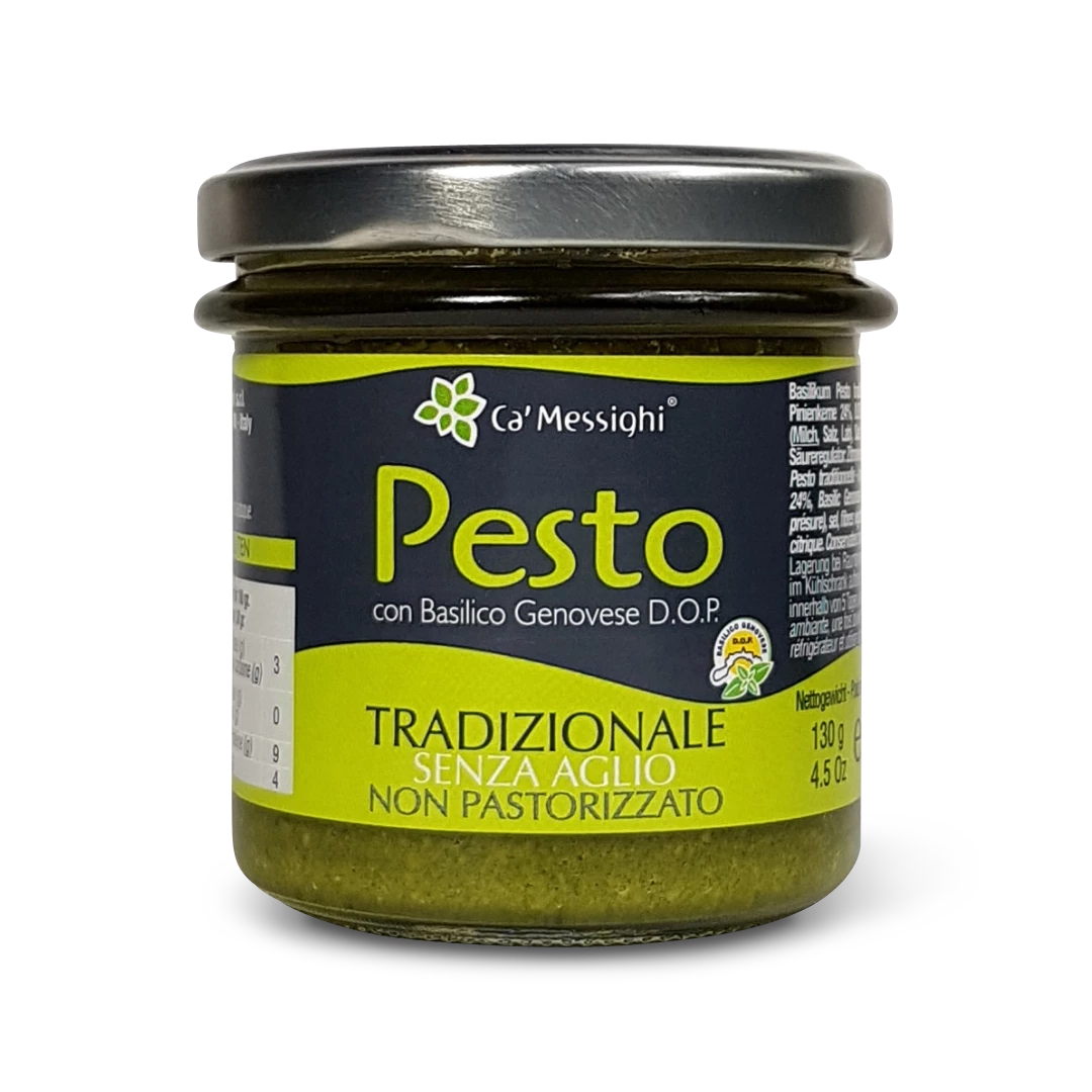 Auch ohne Knoblauch (senza Aglio) ein Genuss: herrlich grün und ein wunderbares Aroma – wenn es diese eine weltberühmte Sauce geben sollte, ist das Basilikum Pesto alla Genovese (nach Genueser Art) ein würdiger Kandidat. Und Ca’ Messighi mit dem Pesto Tradizionale der entsprechend anerkannte Hersteller. Erstklassiges Olivenöl, original Genovese Basilikum, bester Parmesankäse, Pinienkerne und ein paar Gewürze – mehr braucht es nicht.