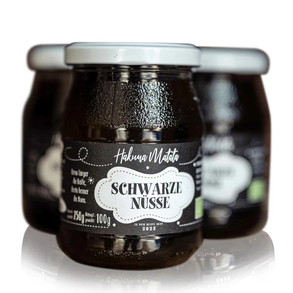 Mit diesen Schwarzen Nüssen kaufen Sie ein von HAKUNA MATATA in Handarbeit hergestelltes Produkt. Die beiden Köche Michael Hofer und Philip Klingel haben mit Ihrer Freiburger Manufaktur die traditionelle Einmachkunst entstaubt. Täglich produzieren sie von Hand Eingewecktes und Eingekochtes – mal zeitgemäß, dann extravagant oder auch klassisch. Hakuna Matata Freiburg nutzt ausschließlich Produkte der Saison – Erdbeermarmelade im Winter zu kochen oder Zitrusfrüchte im Sommer zu verarbeiten sind keine Option. Aber die Produkte dieser kleinen exquisiten Manufaktur, die gibt es ganzjährig bei uns Viktualien.shop.