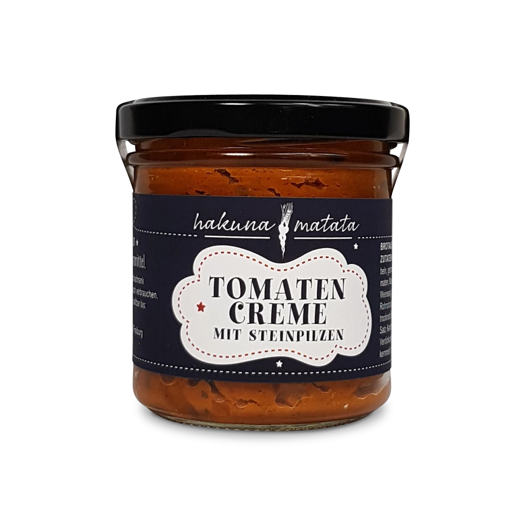 Mit dieser pikante Tomatencreme mit Steinpilzen kaufen Sie ein von HAKUNA MATATA in Handarbeit hergestelltes Produkt. Die beiden Köche Michael Hofer und Philip Klingel haben mit Ihrer Freiburger Manufaktur die traditionelle Einmachkunst entstaubt. Täglich produzieren sie von Hand Eingewecktes und Eingekochtes – mal zeitgemäß, dann extravagant oder auch klassisch. Hakuna Matata nutzt ausschließlich Produkte der Saison – Erdbeermarmelade im Winter kochen oder Zitrusfrüchte im Sommer zu verarbeiten sind keine Option. Aber die Produkte der Freiburger Manufaktur, die gibt es ganzjährig bei uns im Viktualien.shop.